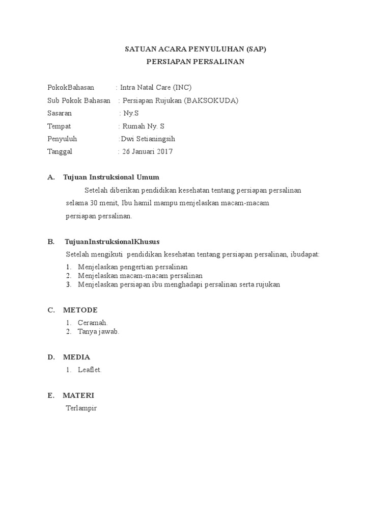 . SATUAN ACARA PENYULUHAN SAP PERSIAPAN PERSALINAN Pokok Bahasan. Sebagai calon ibu apalagi jika ini merupakan kali pertama Anda akan menjalani persalinan tentu ada rasa bingung mengenai persiapan melahirkan. Saat istri sedang kesakitan akibat dari kontraksi tak ada salahnya suami berperan aktif untuk membantunya.